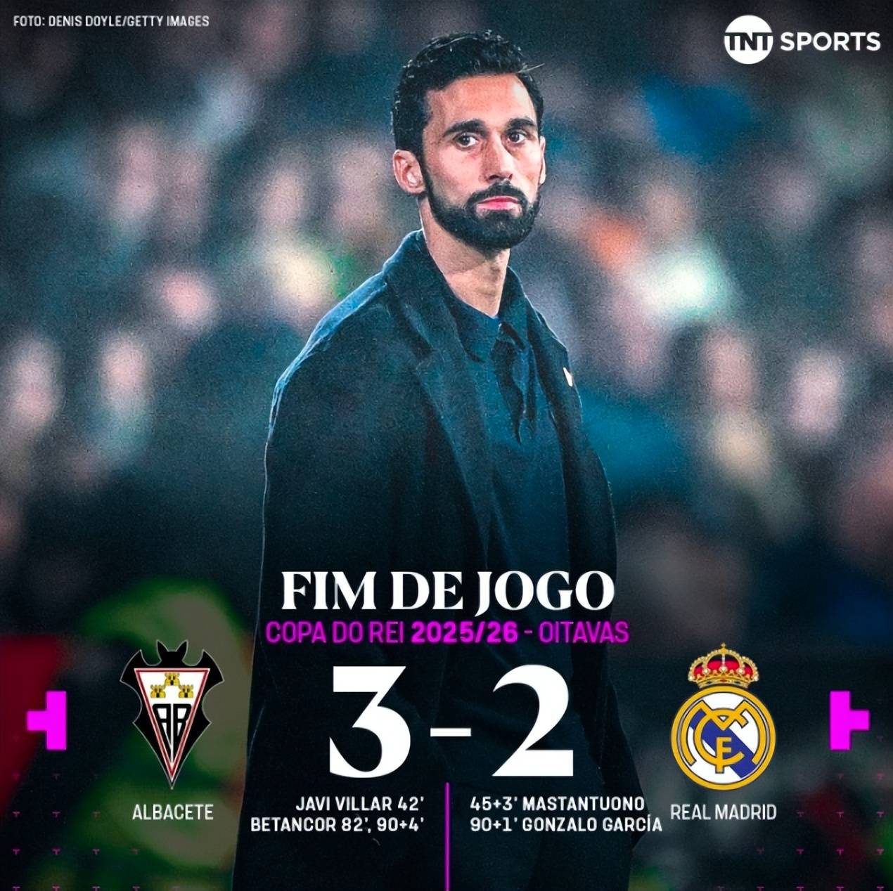 进球后的贝坦科尔和队友疯狂庆祝,主场球迷山呼海啸如同夺冠一样。最终,皇马客场2-3被来自西乙的阿尔瓦塞特淘汰,爆出超级冷门。