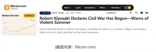 畅销个人理财经典《富爸爸,穷爸爸》的作者罗伯特·清崎(Robert Kiyosaki)宣称“美国内战已经开始”,警告经济崩溃并呼吁转向黄金、白银和比特币,因为法币信任消失。 清崎警告称,因为民间紧张局势爆发,准备迎接暴力金融风暴。 清崎就日益升级的暴力、摇摇欲坠的金融体系以及他现在称之为内战的开始,发出了大胆而紧急的警告。《富爸爸,穷爸爸》几十年来一直是全球畅销书,翻译成几十种语言,被认为改变了数百万人的财富和金融教育方式。 6月9日,清崎在社交媒体平台X上分享了他悲观的展望。他写道:“内战已经开始。洛杉矶的移民及海关执法局突袭引发大规模暴力。我相信我们和世界将面临一个漫长、炎热而暴力的夏天。” 这位著名作家将当今的动荡上涨与威廉·施特劳斯(William Strauss)和尼尔·豪威(Neil Howe)的历史理论《第四次转变》(The Fourth Turning)联系起来,该理论认为每80年,社会进入一个深刻的危机和转型时期。 清崎指出:“过去的第四次转变是大萧条/第二次世界大战、内战和美国革命。” 对清崎来说,这场全球解体的核心是经济,尤其是对法定货币信任的崩溃。他将所谓的“合法盗窃”归咎于中央银行和通胀政策。 他强调:“问题在于,我们的银行家们正在通过中央银行印制的‘假钱’、‘伪钞’窃取人民的财富。” 清崎宣称他相信现行体系已经到达崩溃的边缘:“我相信银行家掠夺世界的时代即将结束。真正的货币、黄金、白银和比特币将力量从腐败的银行家手中夺走。”