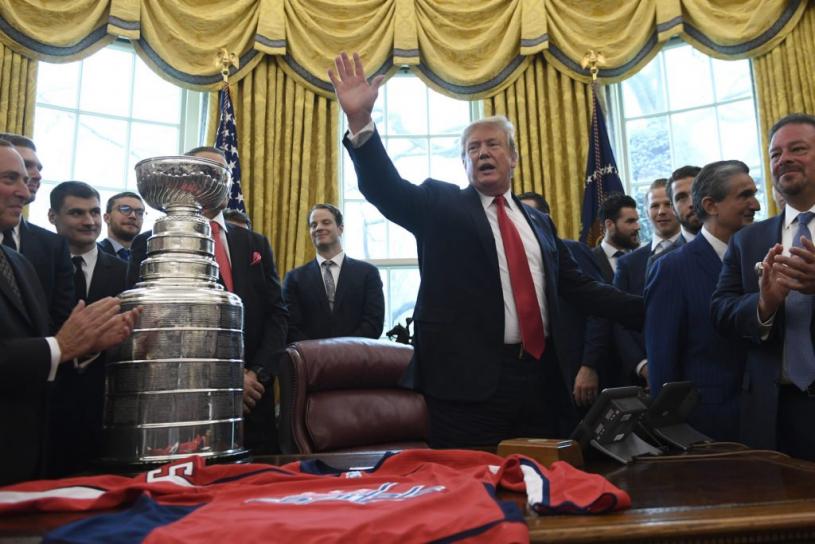 (川普 2018 年时在白宫接见华盛顿首都队球员。)