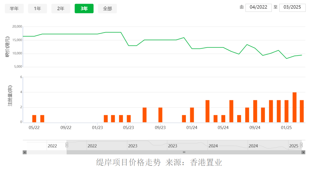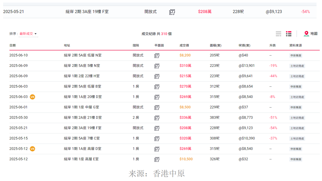 近日,位于香港屯门的“缇岸”(原名:恒大・珺珑湾)项目因大幅降价在当地市场引发广泛关注。 该项目于2019年首期开盘时,凭借精准定位小户型“上车客”,创下151套房全部售罄的辉煌成绩,一度成为区域内的标杆项目。 后因恒大陷入流动性危机,该项目历经了暂停销售等风波,最终由福彩发展接管并更名为“缇岸”。 6月16日,缇岸大幅下调27个单位的销售价格。这些单位的实用面积为223—461平方呎(1平方呎≈0.09290304平方米),总价为214.8万—417.3万港元,部分房源的最高降价幅度超过六成。 6月17日下午,中原地产亚太区副主席兼住宅部总裁陈永杰通过微信向每日经济新闻记者表示,由于香港没有相关价格限制,价格基本由开发商自行决定,但一般降价幅度不会如此之大。目前香港一手住宅供应持续高企,促使开发商不得不采取更积极的定价策略去库存。 曾经开盘“日光”,如今最高降价超六成 事实上,缇岸项目大幅降价,一定程度上反映了香港市场上行期与调整期的鲜明对比。 2018年,恒大斥资66亿港元从恒基地产手中购得香港屯门地块,楼面价高达8300港元/平方呎,创下区域楼面价纪录。当时正值香港楼市上行周期,恒大在该地块打造的恒大・珺珑湾项目,总投资预计达80亿港元。 缇岸项目实景 图片来源:受访者提供 2019年,恒大・珺珑湾首期发售,恰逢香港放宽按揭保险政策,加之项目主打200—300平方呎小户型、总价低于600万港元的精准定位,瞬间点燃市场热情,吸引了大量投资客入场,并创下超额认购15倍、首期推出的151套房全部售罄的辉煌成绩,成为香港楼市的“明星项目”。 然而到了2021年,恒大债务危机爆发,恒大・珺珑湾项目迅速陷入困境,先后经历项目更名、销售暂停、中介机构追缴佣金等问题。 6月16日,缇岸项目大幅下调27个单位的销售价格。这些单位的实用面积为223—461平方呎,总价为214.8万—417.3万港元,其中最高降价幅度超过60%。 以5座21楼F室为例,该户型实用面积为227平方呎,总价从578万港元降至228.7万港元,单价从2.55万港元/平方呎降至1.0万港元/平方呎,降价幅度达60.4%。 “目前项目主要在售的是三房单位,面积为798平方呎,总价在680万至830万港元之间。现在一房的最低售价为320万港元,此前最低售价228.7万港元的房源已经售罄。”6月17日上午,香港房产中介吴先生通过微信告诉每经记者。 缇岸项目户型实景 图片来源:受访者提供 陈永杰向记者表示:“目前香港的一手住宅供应持续高企,截至5月底,一手房库存录得2.14万伙(套),促使开发商不得不采取更积极的定价策略去库存。例如,近期发售的大围新盘‘UNI Residence’定价较同区新晋二手屋苑有约20%至30%的折扣,而港岛区黄竹坑站上盖物业‘滶晨’首批折实价亦低于市场约10%至15%,这都反映出香港市场新盘降价并非个案。” 记者注意到,此次缇岸项目大幅下调房源价格,除了当时购房的业主遭受明显损失外,地产中介也未能幸免。其中,中原地产和利嘉阁地产分别被缇岸开发商拖欠超过1亿港元和3000万港元佣金。据了解,中原地产已向高等法院申请简易判决,利嘉阁地产亦启动法律程序追讨。 与此同时,该项目在二手房市场也出现了明显的价格下跌。 据香港中原网信息,截至6月17日,缇岸项目的不少二手房源价格跌幅超过50%。如5月21日成交的一套2期3A座19楼的房源,面积为228平方呎,成交价为208万港元,较买入时的价格下跌约54%。 香港置业数据显示,缇岸项目在2022年6月的成交单价为1.73万港元/平方呎,而今年3月的价格为9402港元/平方呎,回调幅度约45.7%。 “缇岸项目虽然价格较之前大幅降低,但相较于中环、铜锣湾等核心商业区,其位置较为偏僻。在当前香港银行同业拆息降低、供款成本减少的情况下,其实有更多选择。”6月17日下午,香港房产中介刘先生通过微信告诉记者。 业内预测:6月香港新房成交将迎改善 6月以来,香港楼市持续以一手新盘为主导,热度不减,而二手市场则在观望情绪及新盘分流的共同影响下,维持成交高位横盘态势。 据利嘉阁地产研究部公布的6月预估数据,香港一手私宅买卖登记量预计可达1980宗,较5月份的1607宗增长约23%,将创下近三个月新高。 利嘉阁地产研究部主管陈海潮分析指出,6月以来,中美关税战谈判取得阶段性进展,加之港元拆息有所回落,显著减轻了客户的供楼负担。适逢西贡新盘新一期推出,每轮均告售罄,其中至少700宗成交将计入6月份的登记数,这无疑将推动6月份新房登记量进一步攀升。 相对而言,目前香港二手房市场仍处于成交高位盘整状态。 根据香港美联物业的数据,6月前两周(6月2日—15日),香港35个屋苑共录得166宗成交,较上月同期(5月5日—18日)的136宗增长约22.1%,显示出二手房市场同样活跃。 美联物业首席分析师刘嘉辉认为,随着6月二手房交投表现向好,预计今年上半年香港二手住宅成交量有望达到2.2万宗,较去年上半年的2.16万宗微增约2%,并将创下自2021年下半年以来的3年半新高。 每经记者注意到,尽管部分业内机构预期香港楼市6月成交情况将有所改善,但5月的成交数据显示,香港楼市在5月呈现“成交转弱”的态势。 香港土地注册处数据显示,5月所有楼宇买卖合约数为6442宗,同比和环比分别下降12.5%及10.9%,宗数回落至今年2月以来的近3个月低位;楼宇买卖合约总值为498.5亿港元,较去年5月下降20.7%,较今年4月微降0.5%。 相较而言,香港一手私人住宅成交量表
