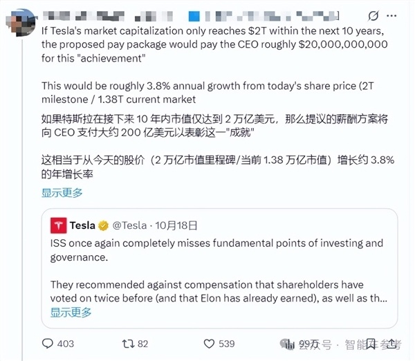 当然,支持者也大有人在。特斯拉官方账号已发文呼吁股东投票赞成,头号“铁粉”“木头姐”凯茜·伍德也预测,该方案将像2018年那样以压倒性优势通过。