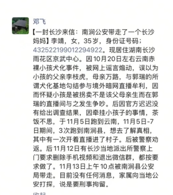 云南“野孩子”事件引发全网关注,很多中国妈妈不惧当局压力持续为孩子发声,但遭到中共打压。一位湖南妈妈因为去云南查看真相,被跨省抓捕。 11月17日,微信公众号“流言晖语”发布消息称,“南涧终于对妈妈们下手了”,消息引用了知名公益人邓飞的微信对话截图,说湖南一个妈妈因为介入云南“野孩子”事件被云南当局抓捕。 对话截图显示,一位居住在湖南长沙雨花区京武中心的35岁妈妈,名叫李靖,因牵挂小孩子的事情,于11月5日赶到云南,11月5日-7日,三次去往南涧县,想去了解真相,其中一次开著直播进了村子,后被当地警察劝反。11月12日,长沙当地派出所警察上门要求她删除手机视频和退出微信群,她都按要求做了。 11月13日上午10点,她被南涧县公安局公安带走,目前没有任何消息。其家属向当地公安局打探消息,收到回复称要其被刑事拘留。 知名公益人致云南省委书公开信 要求解禁社交媒体帐号 因为“野孩子”发声而被全网禁声的公益人士邓飞,再次致信云南省委书记王宁的公开信,要求恢复被封禁的社交媒体帐号。 信中说,11月6日,他公开一个“赤裸小孩”父亲李某发的视频,内有一个被强迫在地上爬行的女孩,他询问这个女孩是谁,为何被一男子强迫爬行,女孩现在是否安全? 他的询问没有获得回复,相反,他的微博、小红书和个人微信号等多个社交媒体帐号相继、迅速被禁言。 信中说,他不得不给云南省委书记写信,恳请督促云南相关部门关注和核实视频中出现的“被迫爬行女孩”,查明真相。