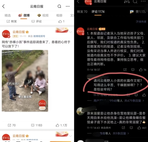11月14日,有网友发现,云南日报微博帐号已经偷偷把这篇报道删除,网友讽刺,“请问云南野人小孩的长篇作文呢?写的这么辛苦,干嘛删掉啊??是怕坐牢吗?” “云南日报悄咪咪把11号的小作文删了,只剩下一句话,这是为什么呢?” 尽管中共当局不断的删帖、封号,大陆网友依旧持续不断的为“野孩子”发声,网友说,“这件事情如果真的不了了之,那社会上出现器官移植,虐待儿童,我感觉这都不是事儿,都是过度溺爱”“亿万人眼皮子底下都敢直接打马虎眼,其他不敢想”“从事件引爆网络到现在,我们看到了什么?一篇将『虐待』美化为『溺爱』的新闻稿,一个疑点重重的“摆拍”视频,以及面对全网核心质疑时,长达数周的集体沉默”。 |