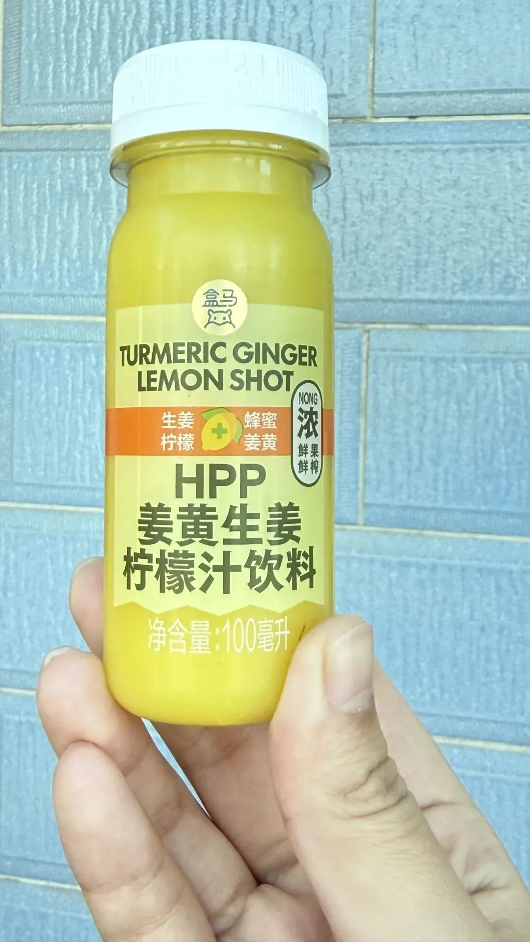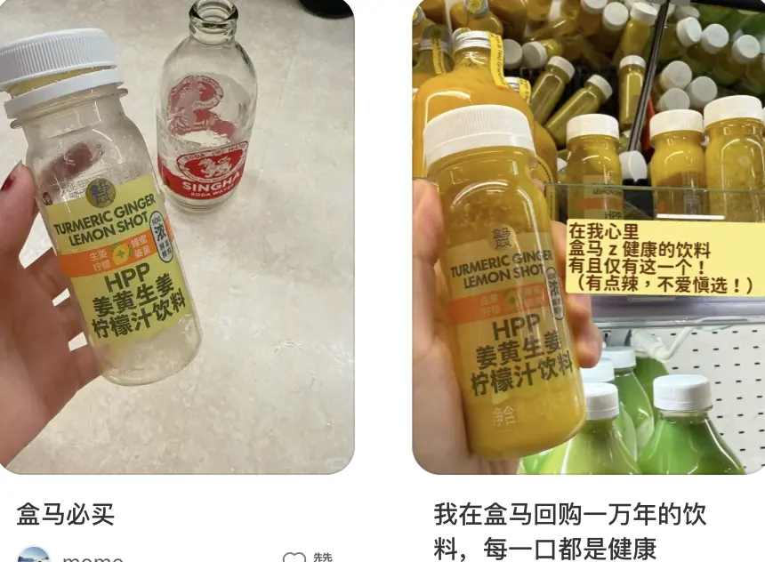说抢购一瓶姜黄饮,并不是夸张。 虽然姜黄之风起了很久,但盒马的姜黄饮在我写稿时还是一瓶难求。 今年6月中刚一上市,就有超过3000人下单。 整个夏天,想要在盒马抢一瓶姜黄饮,难度不亚于在超市和大爷大妈抢鸡蛋。如今5个月过去了,累计下单人数超2万的情况下,它的口碑却意外地坚挺:好评率高达99%,回头客也多。 关键是,打开盒马App,这瓶黄色小饮料仍时常断货。姜黄饮顶流至此,出于尊重我也给了它奢侈品同等待遇: 为了买一瓶8.9元的姜黄饮,硬是给它配了40块钱的货。 但当我满怀期待到家,翻遍袋子看到躺在袋子底下的主角的时候,心情颇为复杂:一种我虽然知道自己的爱豆不高,但看到他确实矮的那种复杂。 虽然我知道它只有100ml,但竟真的没有我巴掌大,看起来不过一口的量。
