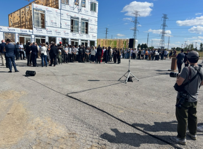Ana Bailao 图源:Toronto Sun “我身后两组房屋是在两天内制造的,并在一周内在现场组装完成。”卡尼在那天的发布会上这样说。他说这话时站在一块依然只是碎石地的空地上(在Nepean的Merivale和Colonnade路口)。 “我们让工人暂时停工,就是为了观察各部分如何组合、电脑设计如何对接、以及结构怎么调整。” 指着一栋还在拖车上的房屋,卡尼说它正要运往努纳武特。不过他整场发布会的表达,都暗示那块刚平整的空地——完全没有地下管线、没有道路基础设施——未来会变成一个新社区。 被批评打造“道具村” 几天后(9月19日),《多伦多太阳报》的记者再去那个地点时,房子已经全撤了,只剩下一台挖掘机和推土机在把碎石地重新整平(如下图所示)。