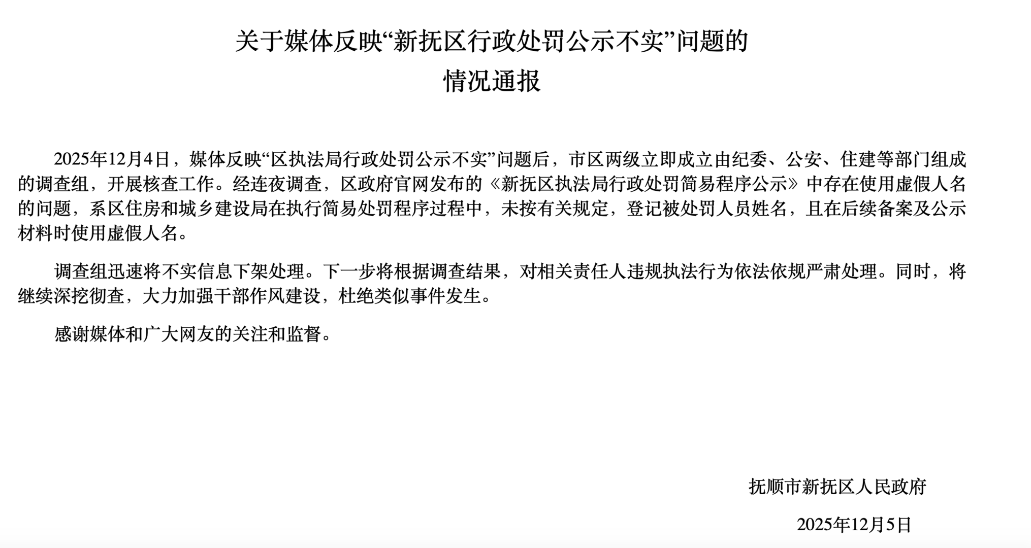 无独有偶,辽宁抚顺市新抚区政府官网2022年5月25日发布的《新抚区执法局行政处罚简易程序公示》里,张吉惟、林国瑞、江奕云因占道经营,每人被罚款50元。但目前该公示已被删除。 12月5日下午,抚顺市新抚区政府就“新抚区行政处罚公示不实”问题发布情况通报称:经连夜调查,区政府官网发布的《公示》中存在使用虚假人名的问题,系区住房和城乡建设局在执行简易处罚程序过程中,未按有关规定登记被处罚人员姓名,且在后续备案及公示材料时使用虚假人名。下一步将根据调查结果,对相关责任人违规执法行为依法依规严肃处理。
