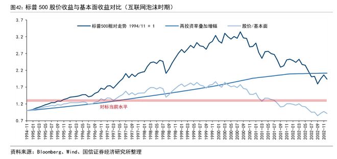 空间测算:估值压力仅为泡沫巅峰的三分之一 尽管AI概念股涨势惊人,但其泡沫化程度远未及互联网时代。报告利用“固有收益模型”对比发现,本轮标普500指数股价跑赢基本面(累计再投资率)的幅度约为27%,而互联网泡沫时期的这一数据在“1→N”阶段末期就已达到69%,在泡沫巅峰期更是高达84%。换言之,当前市场的估值溢价仅相当于互联网泡沫极限水平的约三分之一。 风格分化方面也印证了这一点。自2022年10月以来,纳斯达克指数年化跑赢标普500约6个百分点。相比之下,互联网泡沫期间这一超额收益高达18个百分点。这种差异主要源于基本面支撑能力的提升:本轮AI浪潮中,纳斯达克成分股的盈利能力显著强于标普500整体,基本面对股价的支撑更为扎实,而非纯粹的情绪炒作。