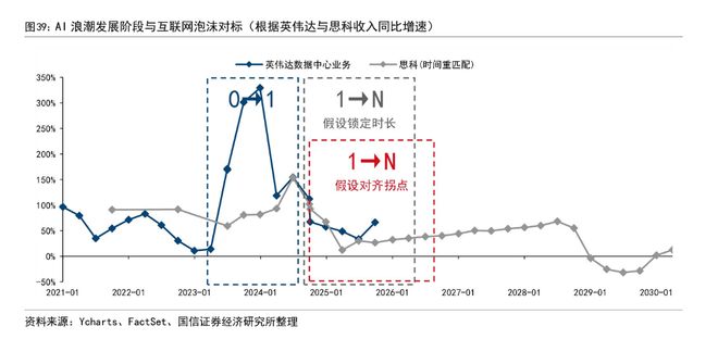 这种资金面的极度充裕,恰逢互联网产业故事的兴起。市场因认知偏差严重低估了光纤技术的供给能力,误以为网络资源将长期短缺,进而支撑了激进的资本开支计划。这种“高估需求、低估供给”的预期,让融资资金转化为产业利润,吸引更多资金入场,形成了自我强化的正反馈循环。最终,这一泡沫并非因高债务杠杆破裂,而是被2000年初一级市场股权资产的集中抛压,以及基本面供给过剩的现实所刺破。 时间之锚:AI正处“1→N”阶段后期 将视线拉回当下,通过对比关键指标,研报认为AI浪潮的时间进度条已走到类似1998年的位置。从产业链营收增速来看,互联网泡沫经历了铺垫期、“0→1”、“1→N”以及“N→N+”四个阶段。英伟达作为本轮AI浪潮的上游代表,其数据中心业务增速走势与当年的思科高度吻合。若以思科的历史轨迹推演,当前AI浪潮正处于营收增速边际回落但仍保持高位的“1→N”阶段。