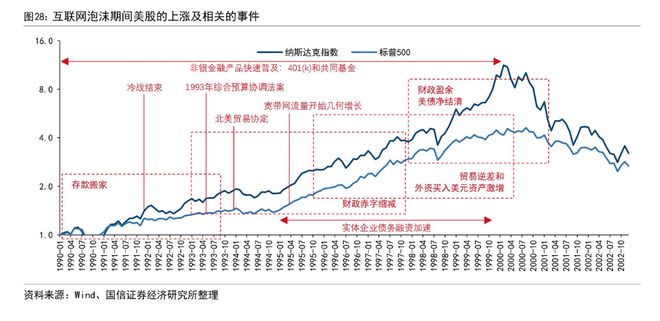 互联网泡沫的本质:资金堆砌的盛宴 研报表示,回顾历史,互联网泡沫并非单纯的产业狂欢,而是特殊时代背景下资金与资产供需失衡的产物。彼时,美国正处于冷战结束后的“和平红利”期,财政盈余导致美债供应大幅减少,形成了严重的“资产荒”。与此同时,存款搬家与养老金制度改革(401k)促使非银金融爆发,叠加贸易自由化带来的巨额外资流入,海量资金涌入权益市场。