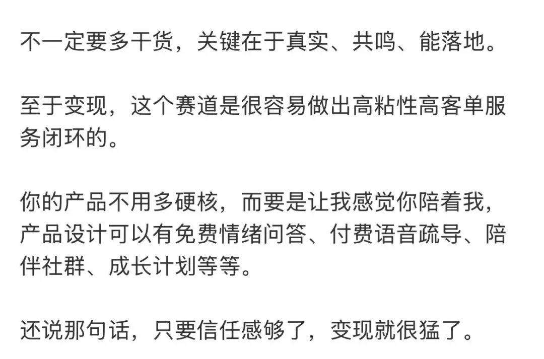 网上有所谓的搞钱博主给想挣这份钱的网友指路时,就直白地说出: 其实情感付费课程不一定要有多少干货,主打一个情绪价值就够了。 “只要信任感够了,变现就很猛了。”