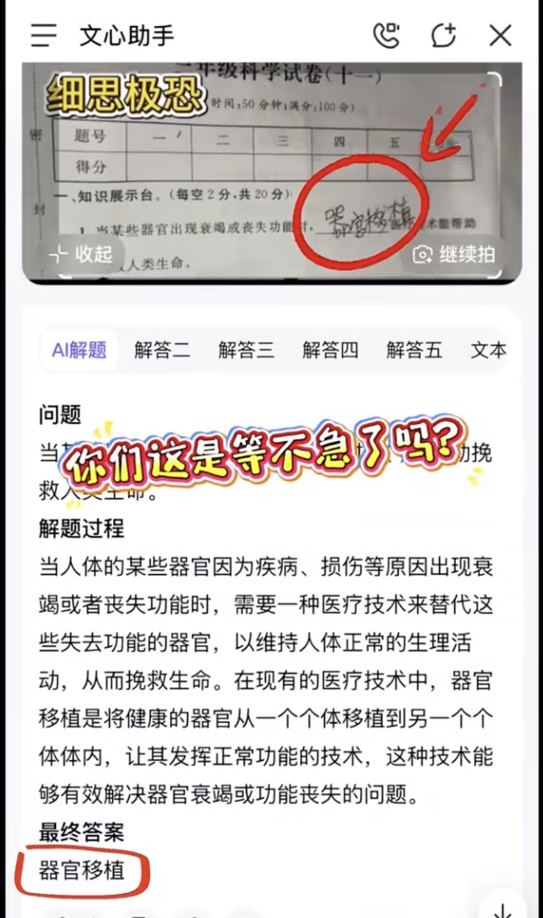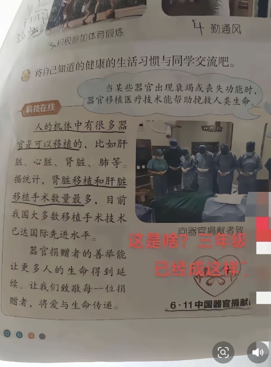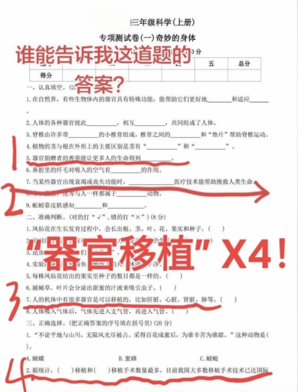 近期,一份流传于网络的中国小学三年级科学科试卷截图,将“器官移植”宣传进入校园的议题推上风口浪尖。该试卷中,仅第一页便有四道题目与器官移植相关,引发众多网友与家长的强烈不安,形容“令人毛骨悚然”。 网传图片显示,这份名为“小学三年级科学(上册)专项测试试卷(一)奇妙的身体”的试卷,在填空、判断与选择题中高频率地嵌入了相关内容。 其中,在填空题中,有两道题目和器官移植有关,宣传所谓的“器官捐献是善举,帮助挽救生命”;在判断题中,一道题目列举了可移植器官的清单,包括肝脏、心脏、肾脏、肺等;一道选择题中,则强调“中国器官移植手术已达国际领先水平” 而这只是该份试卷的第一页,后面还有多少题目和器官移植有关,并不清楚。而在之前就曾出现过类似试卷内容。 按照逻辑推理,科学课测试试卷出现关于器官移植的题目,必定在教材中有相当数量的与此相关的内容。 网友纷纷留言质问:“哪个地方出的卷子,看得我毛骨悚然”、“要从小娃娃抓起”、“王八蛋在毒害孩子,用健康身体去救即将死去及有病的人,违背生老病死自然规律,道反天罡”、“让孩子们打小就觉得捐器官天经地义”。 还有亲身经历的家长表示,“我家孩子回来说过,还说捐献是献爱心,然后我给他看了很多很多现在发生的事情”。