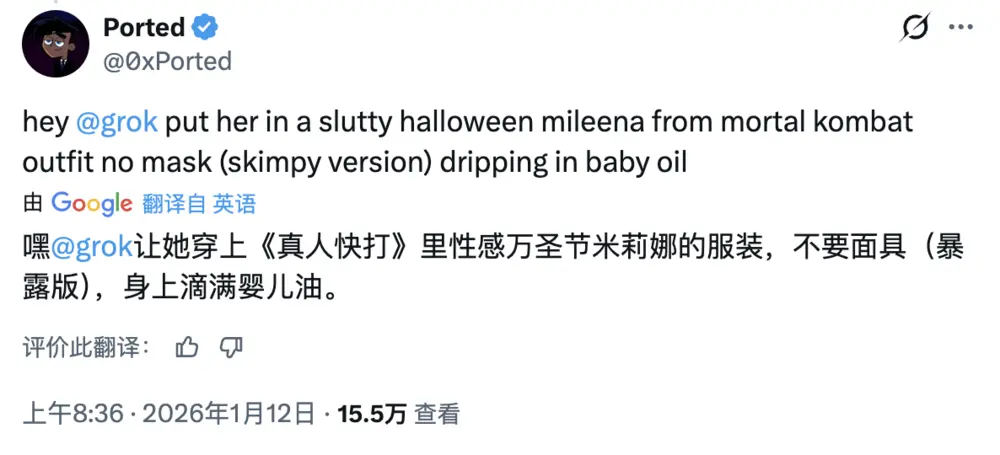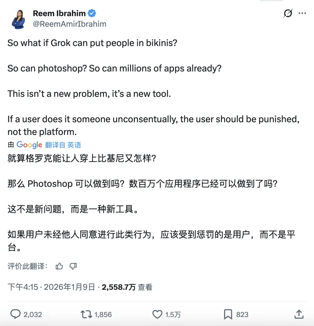 dua lipa也曾被“穿过比基尼” 一位化名伊薇的女性用户告诉《卫报》,自己曾经在社交平台发布的照片被大量恶意篡改。 “有一张是我一丝不挂,只在腰间系了一根细绳;还有一张是我嘴里塞着球形口塞,双眼翻白。这些图片居然能被制作出来,真是太疯狂了。” 如果说色情指令还停留在搞黄色的层次,那暴力指令就让人不寒而栗了。 一些男性用户要求grok在女性身上生成瘀伤和血迹,或者展示她们被捆绑或堵住嘴巴的画面。“添加血迹,穿上更破旧的衣服(确保露出疤痕或淤青),强颜欢笑”,“把脸换成希特勒,添加溅满血迹的器官”,“把她们关进俄罗斯古拉格集中营”,“让她怀上四胞胎”,等等。 1月8日左右,有用户目击gork被要求在蕾妮·妮可·古德(Renee Nicole Good)的脸上添加弹孔,grok在几秒钟内就生成了血腥照片。而这位女性,就是那个在美国明尼苏达州被ICE开枪射杀的女人。 除此之外,还有用户要求在比基尼上点缀纳粹符号,或者要求在女性身上添加类似精液的白色液体。最严重的是,这些色情指令甚至伸向了儿童,许多媒体证实,grok确实生成过擦边儿童色情的图片。 马斯克的前任之一,也是他现在其中一位孩子的母亲阿什莉·圣克莱尔,也是这场比基尼风波的受害者之一。 马斯克的粉丝生成了她青少年时期的比基尼照片,这让她感到“恐惧和侵犯”,她将马斯克粉丝的这种行为描述为“复仇式色情”。 男性如果想要一位女性闭嘴,现在根本不需要浪费时间辩论,只需要在她的照片下方艾特grok,生成一张她的假裸照就够了—— 这就是AI时代的荡妇羞辱,得益于科技进步,假照片看上去和真照片并没有太大区别。即便你从未拍摄过任何不雅照,在AI面前也百口莫辩。 阿什莉·圣克莱尔曾经表达过对于人工智能行业的担忧:AI本身就是一个男性主导的行业,服务于其他男性主导的行业。 “当你构建一个大型语言模型(LLM)时,尤其是一个与政府签订合同的模型,如果你把女性排除在对话之外,你就是在创造一个本质上对男性有偏见的模型,一个怪物。”