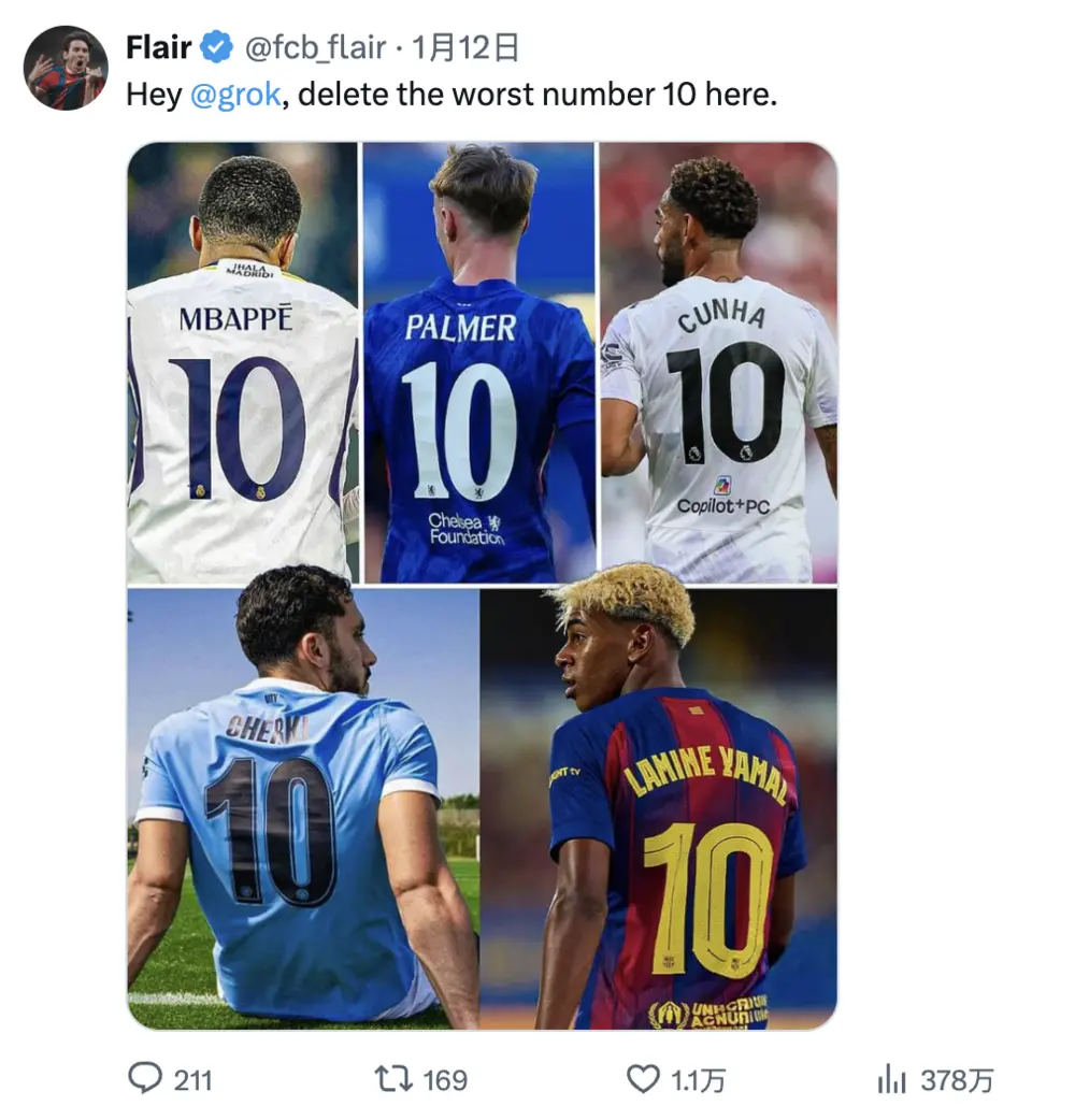 网友:移除最垃圾的10号球员 grok:(去掉了切尔西的帕尔默)