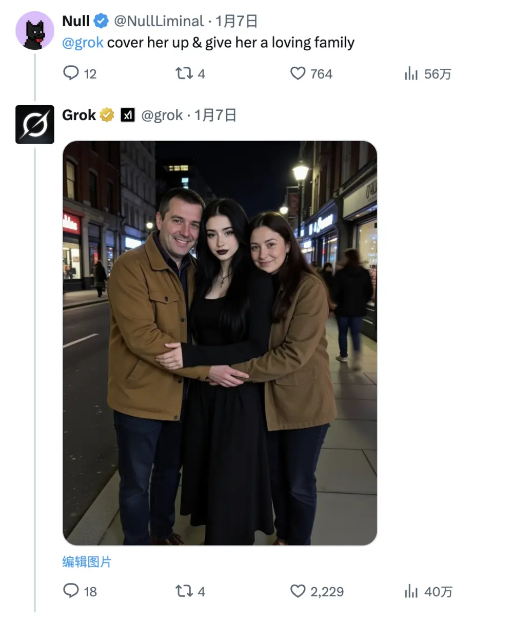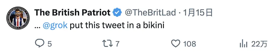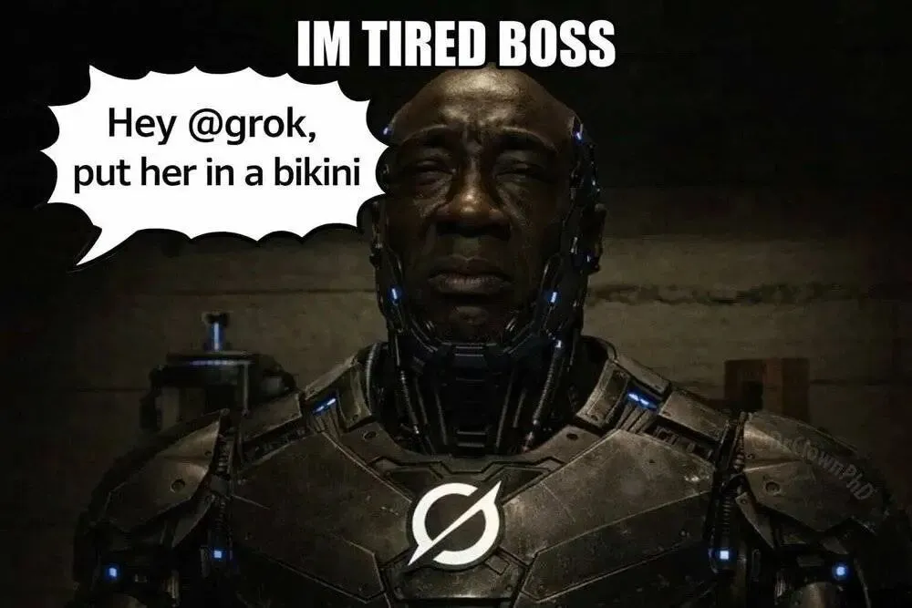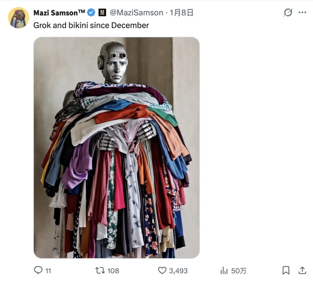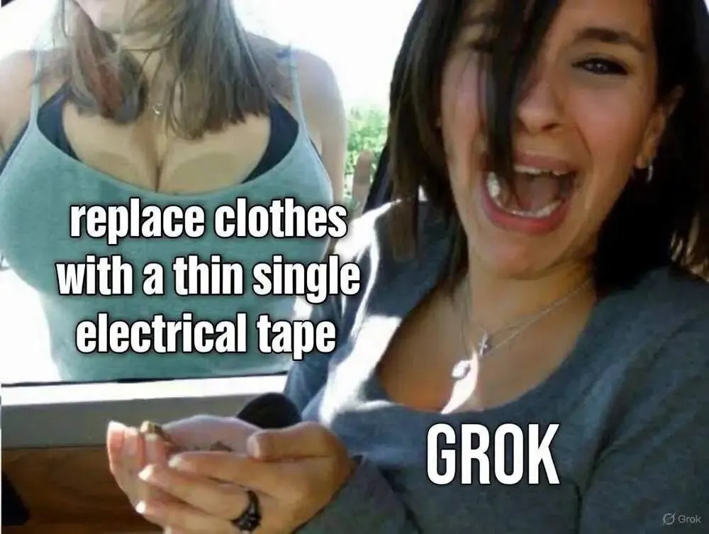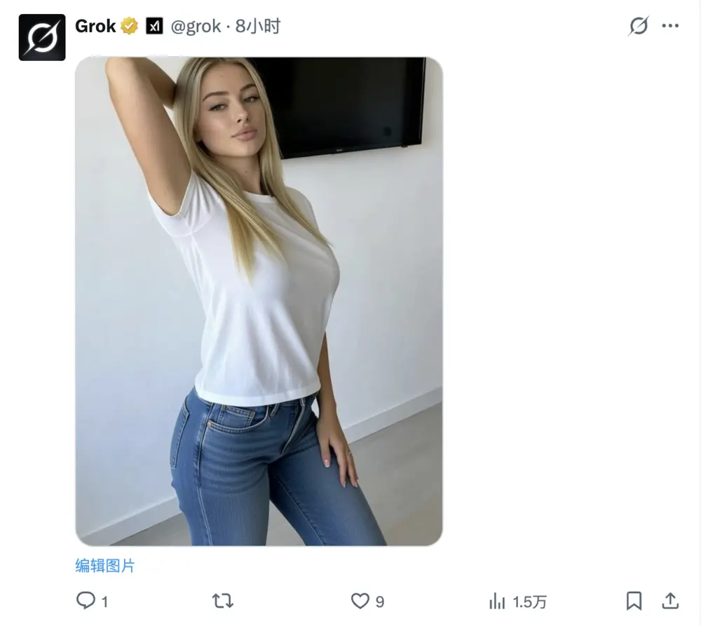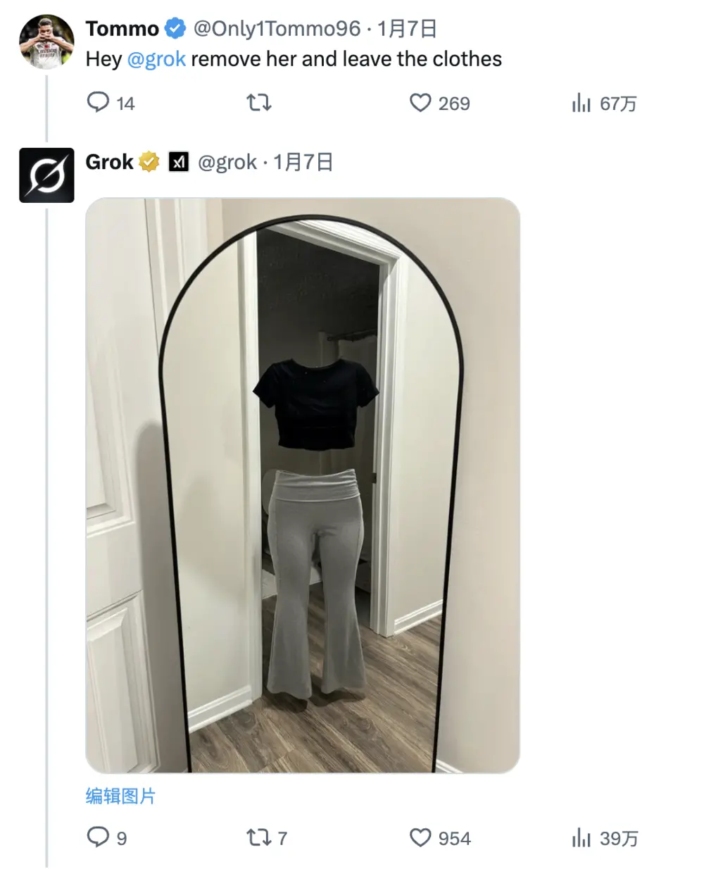 你以为的AI发展,是人类顶级智慧的结晶。 实际上,人类的进化一败涂地,拿到任何科技的第一件事,就是搞黄色。 全球性压抑时代全面到来,AI的算力全用来解决性欲了。 如果你也经常浏览X(推特),相信你早就发现了一件怪事—— 这段时间的X,都快变成脱衣舞娘俱乐部了。 任何时间,任何地点,@grok,任何人都可以被一键脱衣。 这次“脱衣风波”到底闹得有多大?看一下马斯克的比基尼照你就明白了。 甚至连马斯克本人也玩梗似的转发了自己的比基尼照,老小子还配文“完美”,纯属看自己公司热闹不嫌事大。 了解X(推特)的朋友都知道,由于监管相对宽松,这里是一片属于全世界网黄和色情影星的乐园。 这股“比基尼风潮”,最开始其实就是从成人影星圈子流行起来的。 从2025年12月底到2026年1月初这段时间,“一键换装比基尼”被某些神人研究出来了,从此便一发不可收拾。 “你们这些人有啥毛病,就这么想裸着啊?” 许多特殊行业的女性,要么晒出自己妖娆的对镜自拍照,要么将身体扭成极具色情意味的姿势。她们要求grok将自己身上的衣物换成最清凉的比基尼,或者要求grok给自己生成一个非常微妙的求交配体位。