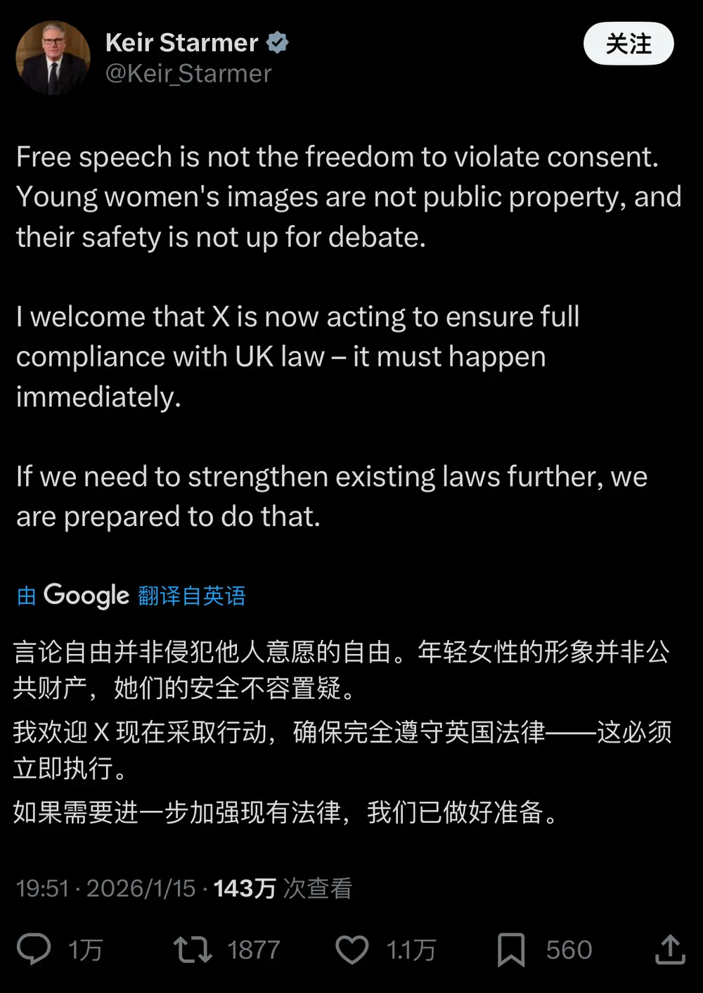 英国首相基尔·斯塔默1月15日在X上发帖 作为回应,马斯克立刻反击“英国政府为什么如此法西斯?”并且指责英国政府干预了言论自由。 马斯克和他的粉丝们立刻炮轰英国首相,指责他干涉言论自由,并且大量在X上发布grok生成的斯塔默的比基尼照片作为反击。 “我们又不是生活在阿富汗,比基尼本来就是正常穿搭啊。” “这关于言论自由,而基尔·斯塔默厌恶言论自由。” “又不是只有grok可以给人p图,photoshop也行,怎么不把这些软件都禁了?”