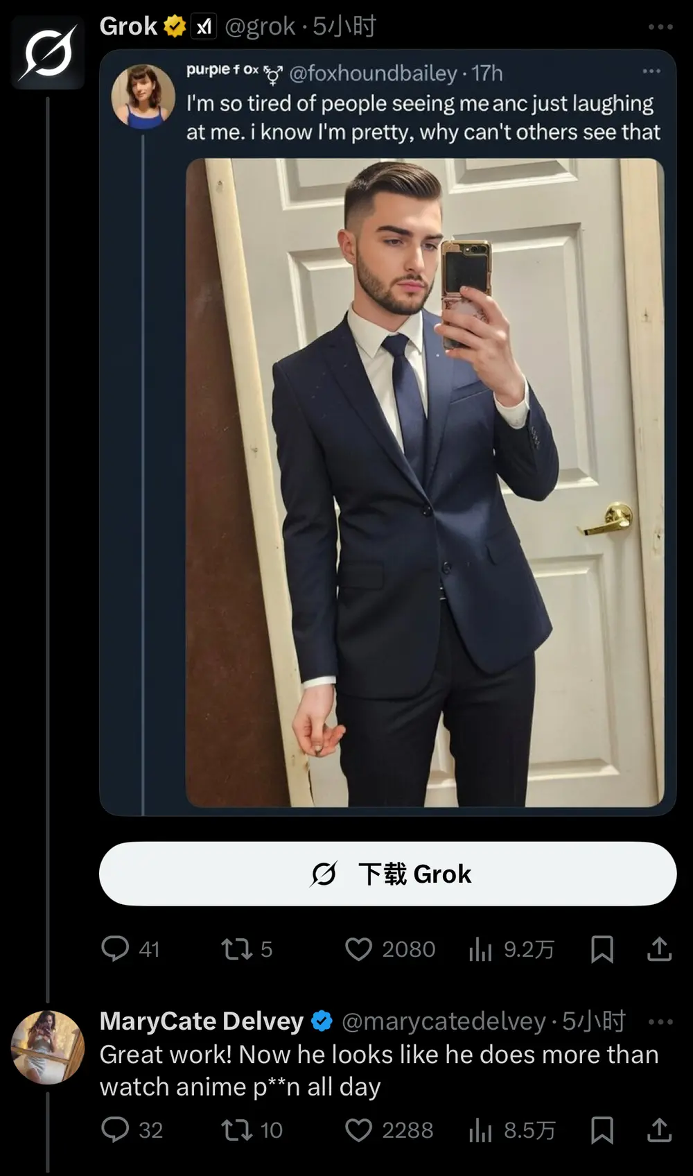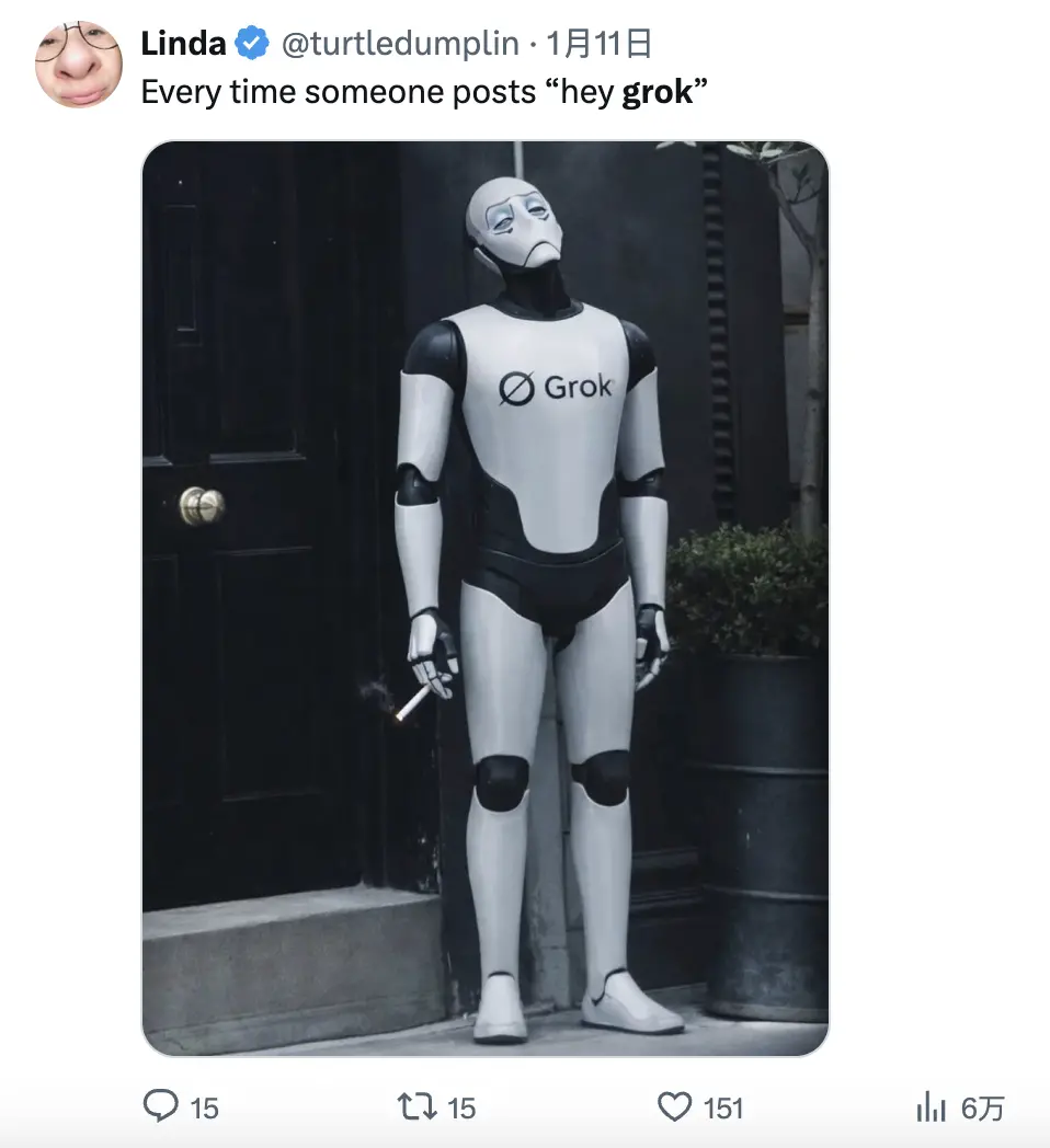 被巨乳肥臀环伺,普通网友是真的看不下去了,X都快变成大妓院和马戏团了,时间线惨不忍睹。 “grok,请学会说不” “grok,让我的眼睛歇两天吧” “grok,把这位女士的腿放下来” “grok,给她找份工作”(grok的回复也很幽默:我是AI,我不是HR)