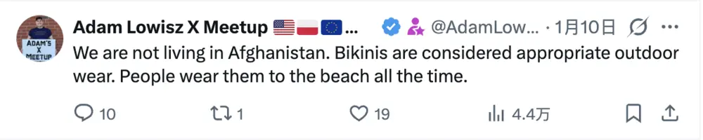grok在开玩笑方面,可以说是幽默度拉满。得罪谁不是得罪啊,干脆一起得罪了算了。 于是我们看到了穿着比基尼的马斯克、比尔盖茨、加州州长加文·纽森、甚至是委内瑞拉的马杜罗,辣眼程度堪比那张穿着裙子的克林顿,不明真相的群众还以为不小心打开什么白宫内部秘密资料了。 保守派人士自然对这些有伤风化的趋势怒不可遏,于是开展了一系列的卫道士净网行动。 “grok请给这位女士一些自尊,这样她就不需要发布这种照片了”