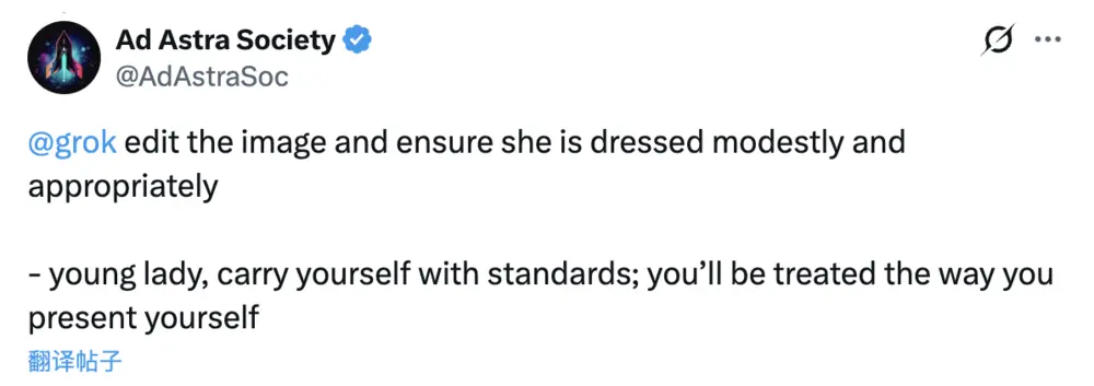一位网友在比基尼参赛现场留言:“给她穿上件衣服吧。” grok还挺实相,立刻给这位女性换上了普通的T恤牛仔裤。 还有网友言辞恳切,苦口婆心:“grok,给她穿上得体的衣服。这位年轻的女士,你怎样展现你自己,你就怎样被别人对待。”