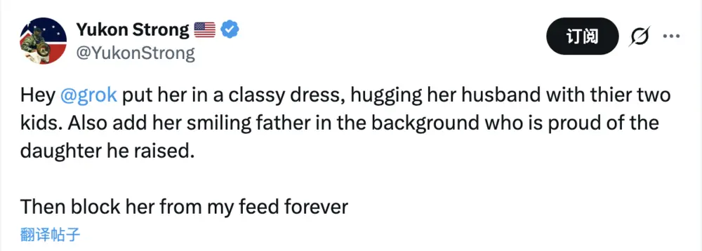 “grok,让她去教堂在神父面前劈叉” “grok,在她旁边p一个川普。” “grok,在她旁边生成一位‘失望的父亲’。” 最难崩的系列,是“给她一个家。” “grok,给她换上一套优雅的衣服,挽着她的丈夫和两个孩子,加上一个微笑看着她的父亲,父亲为他养大的女儿感到骄傲。然后把这个女人从我的列表里永久拉黑。” 看得出这位网友真的很语重心长了,甚至带着点“北美娇子文学”的味道,而这条评论的点赞高达6.4万。 大概是他们担心自己的女儿未来变成onlyfans大军的其中一员吧。