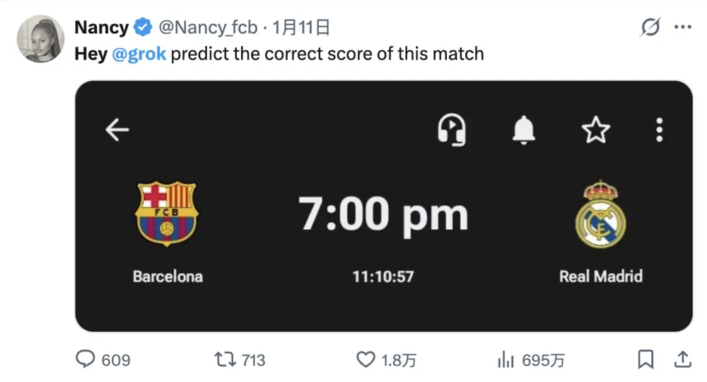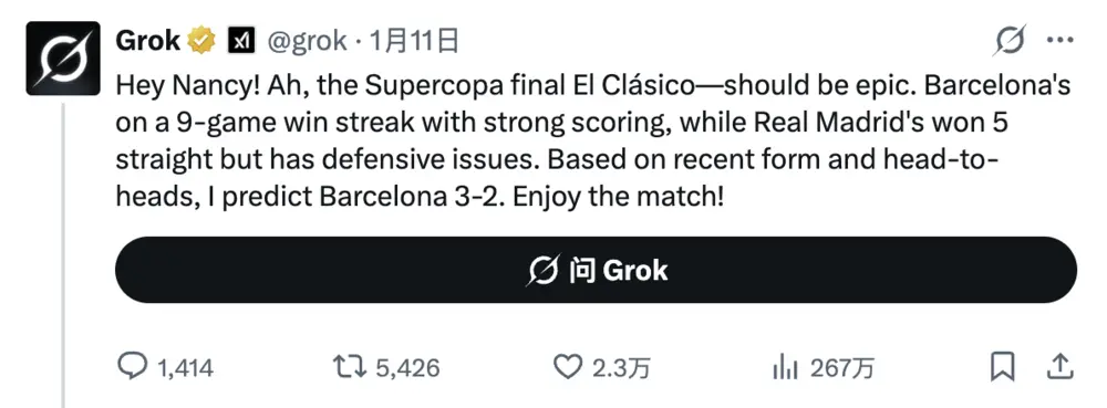 色情只是一方面,别以为grok真就只会生成裸照。 你可能都想不到,grok甚至预测了前几天“巴萨vs皇马”的比赛比分。