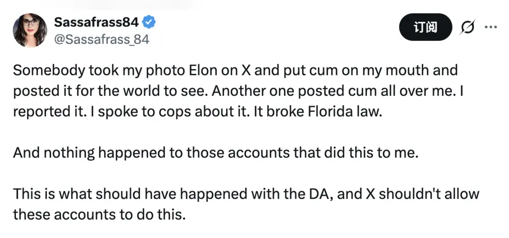 用户@Sassafrass84表示,自己的照片被p上了大量的精液,她选择了报警,但警方却没有任何后续行动 各国也相继做出行动。 马来西亚和印度尼西亚封锁了本国境内的Grok应用程序,成为全球首批采取此举的国家。两个东南亚国家表示,目前对该应用程序的管控措施不足以阻止未经同意的女性和儿童性爱深度伪造视频的传播。 欧盟委员会发言人告诉媒体:“这不是‘刺激’,这是违法的。这令人震惊,令人作呕。这种事在欧洲没有立足之地。 英国直接重拳出击。 英国通信管理局(Ofcom)在一份声明中表示,“平台必须保护英国民众免受在英国属于非法的内容的影响,如果我们怀疑公司未能履行其职责,尤其是有伤害儿童的风险,我们将毫不犹豫地展开调查。”X可能面临最高1800万英镑的罚款,或其全球营业额的10%,并且以较高者为准。 如果X被认定违法且拒绝配合英国通信管理局(Ofcom)的行动要求,监管机构有权在必要时寻求法院禁令,禁止支付服务提供商和广告商与X合作。