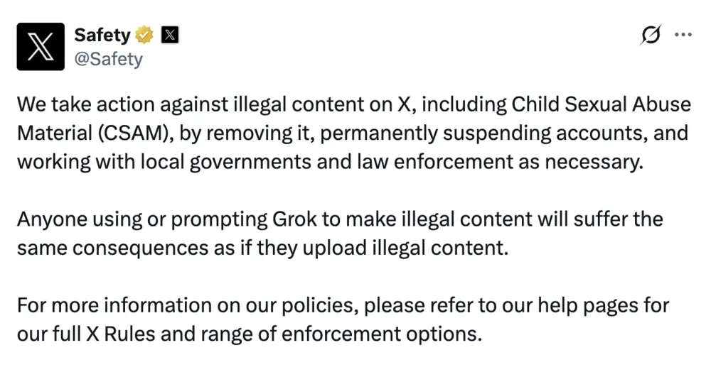 逼得X也没招了,1月9日左右,在许多比基尼请求的下方,grok回应“生成图片功能目前仅对付费用户开放”。 憋到1月15日,官方安全团队总算发表声明—— • Grok 无法再为所有用户编辑穿着暴露服装(例如比基尼)的真实人物图片。 • 在非法地区,生成穿着比基尼、内衣或类似服装的真人图像会被进行地理封锁。 • 为了增加责任感,现在通过 Grok on X进行图像创建和编辑的功能仅限于付费订阅用户。 • 当您在 Grok 设置中启用 NSFW 时,虚拟/AI 成人角色可以裸露上半身,其尺度与 Apple TV 上常见的 R 级电影相同。这反映了美国目前的标准。其他地区的标准会根据各国法律而有所不同。 • 所有 AI 提示和输出都必须符合 X 规则,无论用户级别如何。 马斯克也开始发表各式各样的免责声明,把自己摘得干干净净。