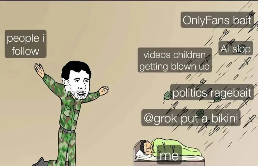 X(推特)自从被马斯克收购之后,变成了一个很复杂难评的社交平台。 门槛哥和门槛姐四处揽活儿,刷着刷着可能就弹出个A片出来,不少网友表示,大庭广众之下都不敢轻易打开这个软件,害怕自己猝不及防地被生殖器甩一脸。 除了黄色内容泛滥,就是政治立场互掐,要么就是随处可见的“@grok,核实他说的是真的吗”。 有不少国外网友吐槽,现在的人低智到“1+1=2”都需要艾特grok核查一下对不对,“在推特上,人人都活得像个流口水的智障”。