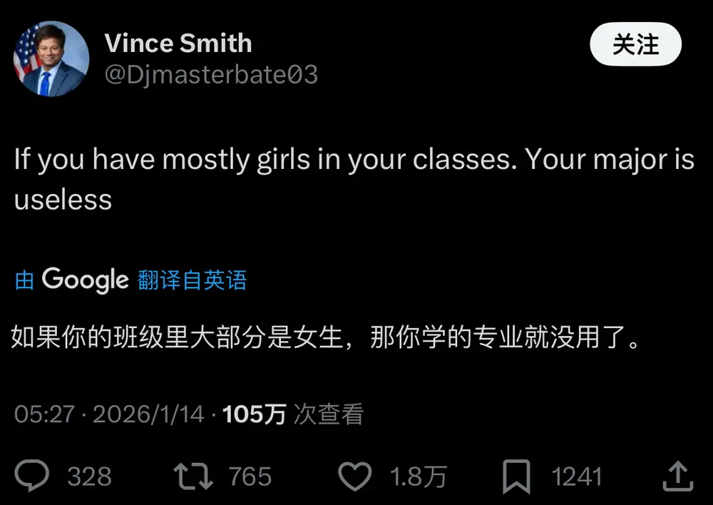 就算你漫无目的地冲浪,也能看到盯着美国国旗的保守派战狼发言,点赞还都挺高—— “当你的班里全是女孩的时候,你的专业可以说是毫无卵用。”