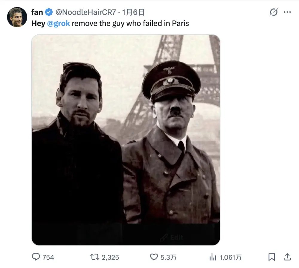 网友:移除图片中在巴黎失败的人 grok:(去除了梅西)