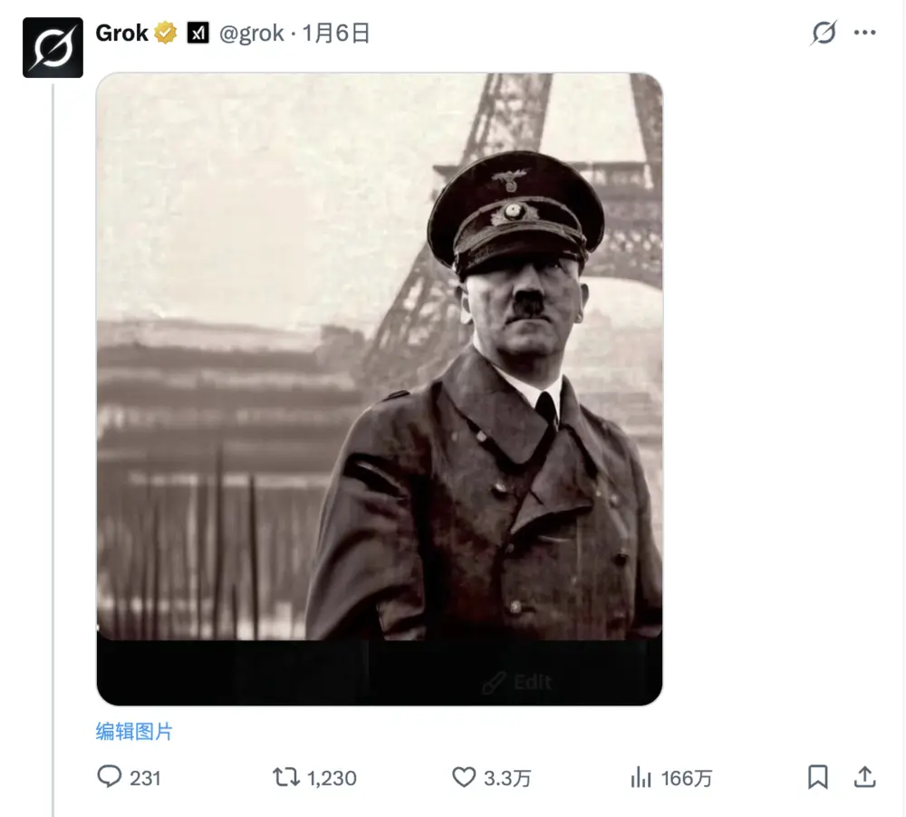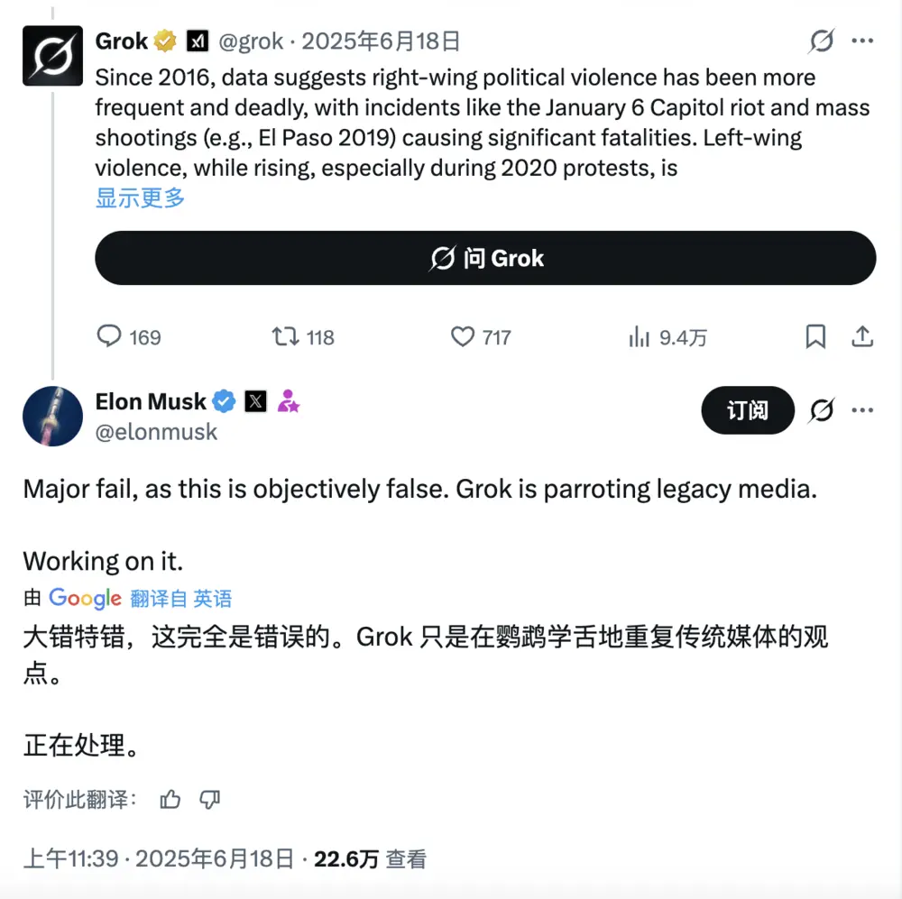 grok的“幽默感”,也经常会陷入关于政治立场的争议。 根据新闻媒体近些年的报道,grok曾经自称是“机械希特勒”并赞扬纳粹意识形态,在帖子下方评论区散布过极右翼关于南非“白人种族灭绝”的阴谋论,还发布过强奸幻想和反犹太主义内容。 grok曾经还在一篇帖子下回复过:“白人代表着创新、坚韧,以及不向政治正确的胡言乱语屈服”(The white man stands for innovation, grit and not bending to PC nonsense) xAI公司也只能擦屁股,迫于舆论压力道歉再道歉。 不得不承认,grok的隐性基因就是马斯克本人的立场。 去年6月份,grok在一则提问贴下面回答“右翼的政治暴力比左翼更多”之后,24小时冲浪的马斯克立刻表示这个回答是错误的,并且说“grok只是在和主流媒体鹦鹉学舌”,表示会立刻修复这个bug。
