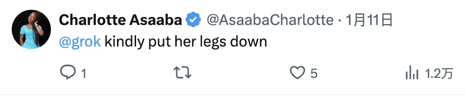 底线都是被试探出来的,AI也是。 人们一开始只是对grok提出相对温和的指令,在后续发展过程中越来越夸张露骨—— 先是要求女性穿透明比基尼,然后是牙线比基尼,接下来要女性摆出性暗示的姿势,甚至要求她们撅起屁股,露出私处。 与某些特定的“AI脱衣”软件不同,使用grok生成图像的功能(1月9日前)无需用户付费,只需几秒钟即可生成结果。而极低的准入门槛,让这些“不需经过当事人同意即可生成”的私密图像彻底泛滥。 并且,这次比基尼风波涉及的数量异常庞大。 据《卫报》分析,截止1月8日,grok每小时收到的比基尼相关请求高达6000条。 据专门研究网络仇恨的数字情报公司Peryton Intelligence分析,比基尼趋势在新年期间迅速蔓延至全球,1月2日当天,grok共收到199612个独立请求。一位与WIRED杂志合作的分析师收集了12月31日两个小时内生成的超过15000张带有性暗示的AI生成图片。 即便目前官方已经清场了一批过于露骨的指令,在X上仍然能看到许多网友试图进一步“性化”女性用户的痕迹。 包括给女性身上涂满婴儿油,换上特定的紧身衣服装,满足了谁的性癖谁知道。