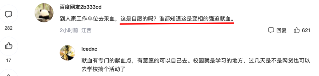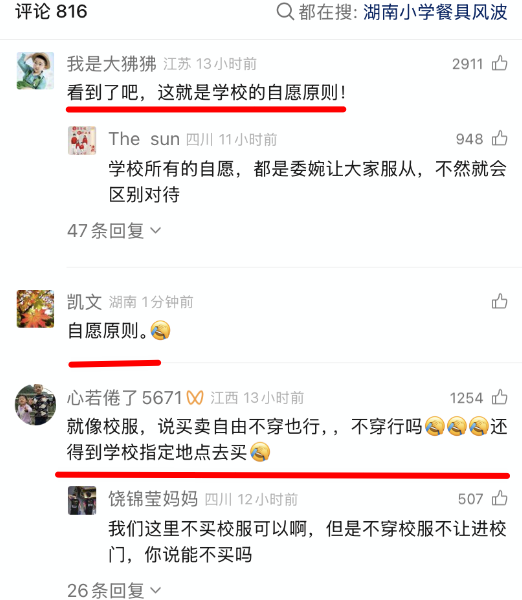 对于家长们来说,这是没办法的事。 可我想问一问,一直强调没有踏入社会的学生,风险识别能力是不足的。也就是说,他们独立判断一件事该不该做的能力,还是没有完全成型的,比如无法充分评估行为的长期健康风险等等。这便是校园里的孩子,因此要有监护人。 那让他们献血,要不要问问监护人? 18周岁以下,法律直说了,“属于限制或无民事行为能力人”,没有讨论空间,绕开监护人,即便说自愿,那也违法。 至于满18周岁了……按理说,也是不该绕开的,因为在“风险认知”这方面,高三跟高二区别不大,都还在上学嘛。但是在法律上,的确,满18周岁了,可以不问监护人。 只不过,虽然可以不问监护人,但是在校园环境中,无法否认有权威影响存在。校长、主任、老师和学生之间,身份存在差异。且“学校”、“老师”、“统一安排”这些字眼本身就构成强心理暗示,会导致一些学生所谓的自愿,实际上是顺从选择。 这可能也是外界、网民以及媒体质疑的真正原因:由于经常性曝光出来的一些其他问题,导致家长们对学校经常使用的“自愿”,没那么大信任了。 简单举个例子,下面这是之前某地一小学“食堂统一更换餐具,学生可自愿选择是否使用”后,一学生自带餐具却被食堂拒绝打饭,结果接连多天饿肚子的事情,曝光后,评论区纷纷在讨论“自愿”这两个字。 有位网友的例子很到位:我们这里校服都是自愿交钱买,但是进学校大门必须穿。你说不买行吗?