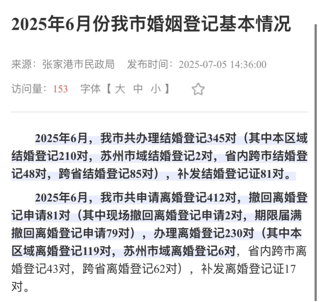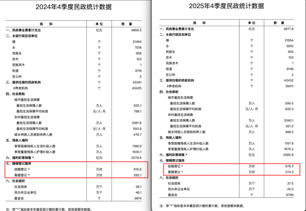 2月12日,有官方媒体发布一篇题为《2025年结婚登记数公布》的报道说: “民政部2月11日公布2025年婚姻登记数据,结婚登记676.3万对,离婚登记274.3万对。 其中,与2024年相比,结婚登记增加了65.7万对,离婚登记减少77万对。” 临近春节看到这么个双喜临门的消息真是太振奋人心了,但是棒完之后我就在思考一个问题,去年到底发生了什么,离婚登记数据能降这么多? 结婚登记的数据咱们以往的文章已经分析过很多遍了,主要是登记政策发力,这里就不赘述了。 但是离婚这块我还真没什么印象有什么给力的政策。 于是我就上民政部的官网查了一下往年的数据,一查直接给我整乐了。 如图所示,与2024年相比,全国结婚登记确实增加了65.7万对,但离婚登记并非是减少了77万对,而是增加了12.2万对。 你看这事整的多尴尬吧,明明是双增双赢的局面,非得整个一增一减,这过年吃席可以去和某某日报坐一桌了。 为什么这个数据误差可以这么离谱呢? 其实是一个很基础的常识了。 就是民政部发的四季度统计数据还只是离婚登记数据,真实的离婚数据还要再加上诉讼离婚的数据。