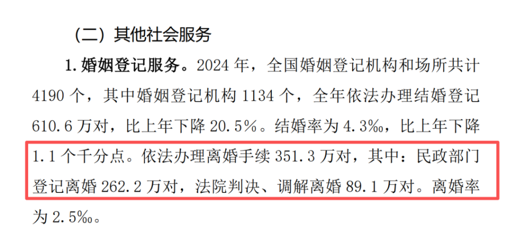 比如说,民政部发布的《2024年民政事业发展统计公报》显示,2024年依法办理离婚手续351.3万对,其中法院判决、调解离婚89.1万对。 这下就破案了,离婚登记减少77万原来是拿清朝的剑斩明朝的官。