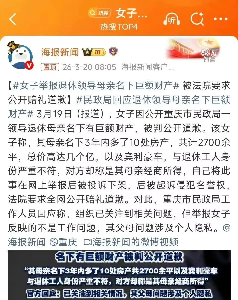 那场战争的文章是不能再写了,写的再柔和都不可以! 我也不是在较真什么,就是一个靠写字生存的人自然需要选择可以写的题材。小说是我最想写的,但当下的快节奏时代,是没有多少人愿意沉下来看一篇波澜不惊的现实平淡小说的。 我在今天还在思考,现在的网上还有什么是可以写的,好像并没有。 下面这个我不知道能不能写? 大体的意思就是,一个女子因为公开了重庆民政局领导母亲的巨额财产,然后被判处公开道歉,而官方给的理由是,举报女子反映的不是工作问题,领导父母的问题涉及个人隐私! 到这里,几个观点: 一是,官方的表面话语很有意思,领导是领导,领导父母的事情就是个人隐私。那么咱们来打个比喻,一个镇长平日里以清廉著称,那么这是一个很好的镇长,但问题是,这个镇长家里有两个无所事事的儿子,天天在外面开豪车,名下几十个房产,出手阔绰,那么问题来了,纪委的人看到这个现象之后是不是需要调查一二? 是不是去调查镇长的儿子,也会被说一句,镇长是镇长,镇长的儿子是人家儿子的隐私? 重庆民政局的这个领导也是,普通的退休工人,短短3年时间内,名下多出了10套房产,还有宾利豪车,这种财产的来源也自然会引起人的注意,那么市民看到了,曝光一下,说白了这也是为反腐倡廉做贡献,无论最终领导有没有贪污,有没有利用父母的身份搞钱,这都是把看到的问题说出来,是在做好事! 这种行为不仅不需要道歉,还需要嘉奖。 现在被判道歉,是不是说市民们已经被剥夺了宪法所赋予的监督权? 二是,最近这些年爆出来的腐败官员很多,前阵子最出名的是湖南高官们的什么几大公子,那段时间网络上几乎都是在吃瓜这些公子们的奢华生活,尤其是湖南当地的网友,那些了解内幕的人将公子们的奢华生活描绘的有声有色,在ta们的叙述下,用京剧里的段子来说,公子们就是天上来的仙人儿!