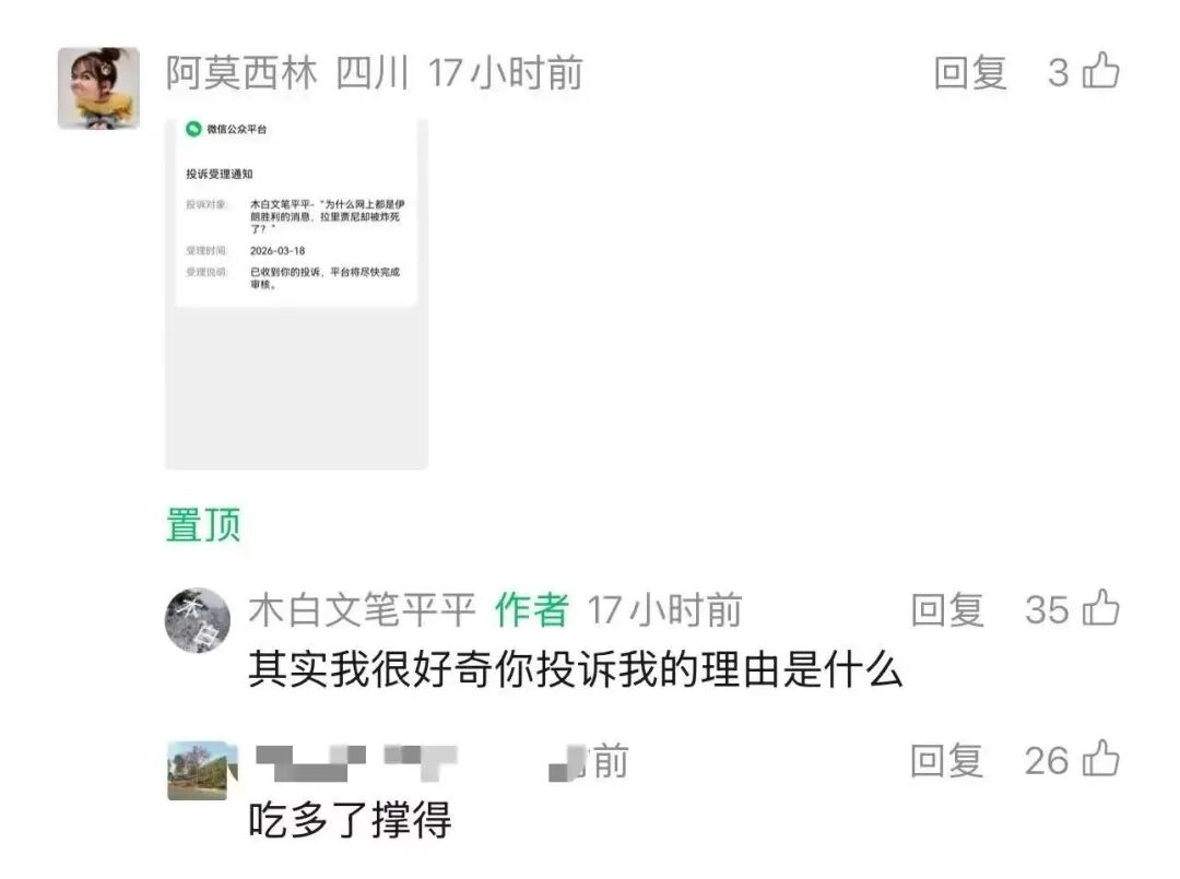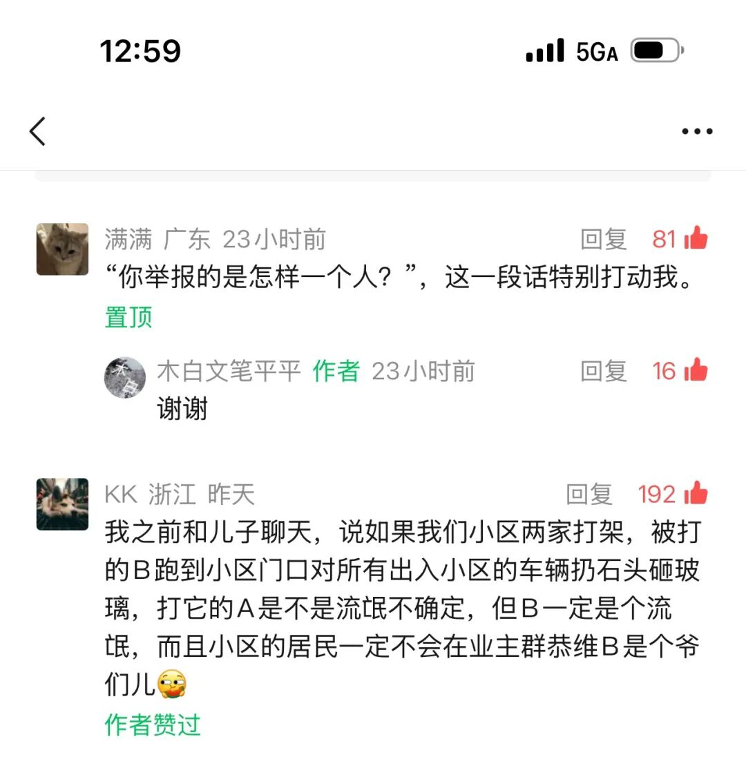 但问题来了,公子们的奢华生活大家都知道,普通人都已经看的清清楚楚了,为何直到ta们的爸爸妈妈被抓了之后,人们才能在网络上议论一二,才可以像是苍蝇看到屎一样扑过去嗡嗡闹闹。 首先,在网络议论几大公子的时候我是压根不知道在长沙圈原来有这样的“仙人儿”,事发后,在群蝇飞舞的时候我没有参与一个字的撰写,因为我觉得既然人家潇洒的时候咱不能说,那么倒台了,咱再跟风说,就有点太贱了。你爱咋地咋地。 也是因为这个无人说的现象,那些愿意在领导还掌握权力的时候敢于曝光其家人财富的行为,都是值得点赞的。 某个电视剧里也有这样一个桥段,大哥你在前面走了,兄弟我没有多少能力,但跟在你后面帮个人场还是可以的。 此时此刻,这个被判道歉的重庆女子就是电视剧里的大哥,而我写这篇文章,就是跟在后面帮个人场。 三是,大家有没有发现一个现象,在国际的战事上被抨击到垃圾堆的写手,渐渐都沉默了,即便遇到身边普通人不好遭遇的事情也不愿意写了。 很多人就说啊,作者,小编,这个话题你咋不写,这个话题没有风险你为啥不写啊,你写一下吧,这种事你该写的! 那么问题来了! 我昨天的文章贴出了一张举报我的截图,她举报了我,将举报我的截图发给我。